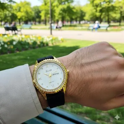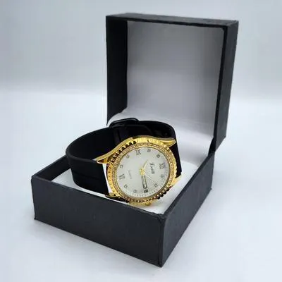 Movement: Quartz (Battery Powered) Case Color: Gold-Tone Bezel: Gold-Tone, Adorned with Crystal Accents Dial Color: White with Textured Finish Strap Material: High-Quality Silicone/Rubber Strap Color: Black Functions: Day-of-the-Week and Date Display Water Resistance: 3 ATM (Splash Resistant) Case Back: Stainless Steel. With Watch Box